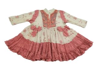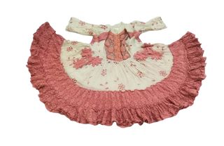 Vendo precioso vestido de gasa 100% algodón, de manga larga, con volantes, calados, abalorios, relieves, etc. Se cierra por delante con corchetes. Talla M. Medidas: 73 cm de largo, 45 cm ancho de hombros y 45 cm de cintura. Arte hecho vestido. Lo entrego en mano. Para coleccionistas de moda o para disfraz.