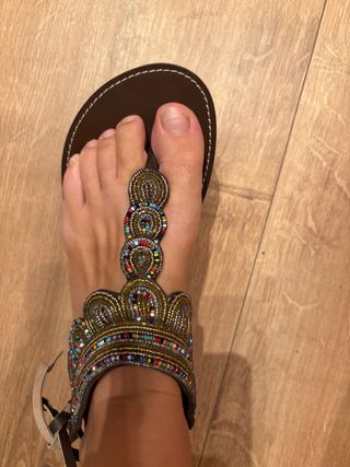 Sandalias planas de cuero en tonos beige y marrón. Son dos sandalias con un diseño único gracias a sus delicados abalorios. Están ligeramente usadas, con algunas marcas de uso en el cuero, pero en buen estado general. - Cuero suave y flexible. - Diseño de abalorios en tonos beige, marrón y azul. - Estilo boho chic.