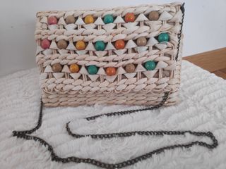 Bolso tipo rafia con un diseño étnico y veraniego. Presenta una banda decorativa en la parte superior con bordados y pequeños espejos, y una fila de flecos de colores con abalorios en la parte inferior. - Material: Rafia - Adornos: Bordados, espejos y flecos con abalorios - Correa: Incluye correa ajustable - Nunca usado.