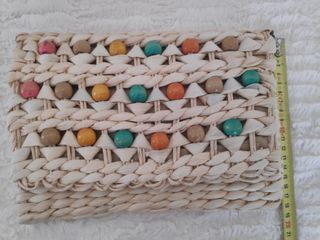 Bolso de rafia tejido a mano, con un diseño único y adornado con coloridos abalorios. - Material: Rafia. - Adornos: Abalorios de madera en varios colores.