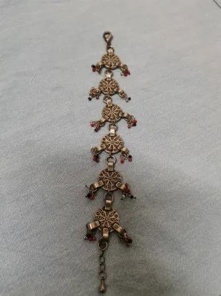 Elegante pulsera con un diseño intrincado y detalles de abalorios. -BISUTERIA. - Diseño con motivos florales. - Colgantes con cuentas rojas y negras. - Cierre de mosquetón.