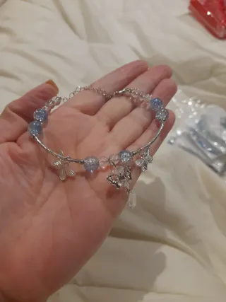 Bonita pulsera con un diseño delicado y adornos. - Abalorios de cristal en tonos azules y transparentes. - Colgantes con forma de mariposa y una gota. - Cadena extensible para ajustar el tamaño. La pulsera viene en una cajita y con un saquito transparente de regalo