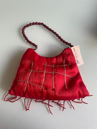 Elegante bolso de mano con un diseño único. - Confeccionado en satén rojo brillante. - Adornado con una cuadrícula de hilo dorado y pequeños abalorios. - Asa y flecos inferiores decorados con cuentas rojas. - Incluye etiqueta original.
