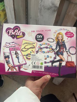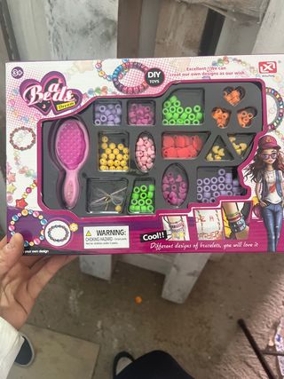 Kit de abalorios para crear tus propias joyas y pulseras. - Incluye un cepillo rosa. - Diversos colores de abalorios: morado, rosa, verde, naranja, amarillo y rojo. - Diseños variados para pulseras.