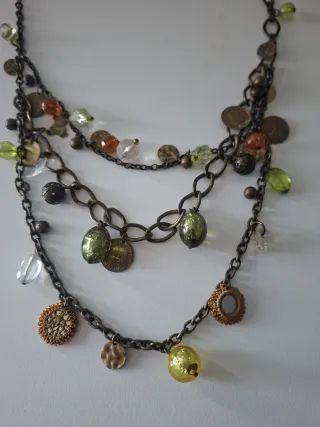 Elegante collar multicapa con un diseño único y detalles encantadores. - Cadena de eslabones metálicos. - Colgantes variados: monedas, abalorios de cristal y detalles texturizados. - Combinación de tonos dorados y verdosos.