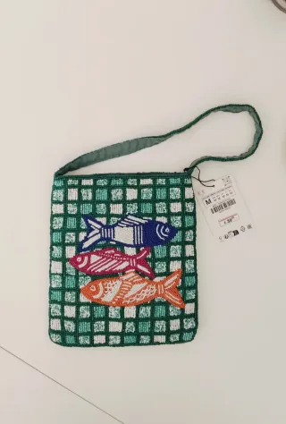 Bolso pequeño con diseño de peces y cuadros, medidas 22x 19 cm. - Decorado con abalorios. - Cierre superior con imán. - Asa para colgar.