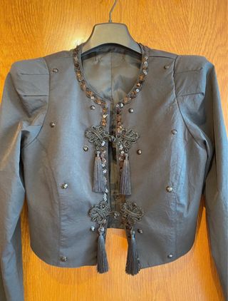 Elegante chaqueta torera negra con detalles de pedrería. - Diseño corto y entallado. - Cuello redondo adornado con pedrería y abalorios. - Cierre frontal. - Mangas largas con hombreras. Chaqueta hecha a mano con diseño de autor.
