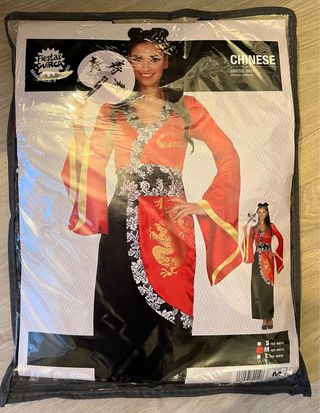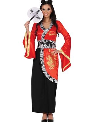 Disfraz de estilo chino para mujer. - Incluye vestido y cinturón. - Diseño con dragón dorado y detalles florales. -No incluye abanico -ESTA RECORTADO Y COSIDO DE ABAJO, POR DEBAJO DE LA RODILLA! No es tan largo porque sino no se puede uno ni mover.