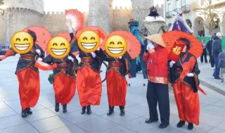 Conjunto de disfraces para grupo con un diseño llamativo. 12 de chinas y 2 de chinos - Colores principales: negro y rojo. - Talla única. Complementos como abanico y sombrilla incluidos en el de chica Precio especial si Comoras varios