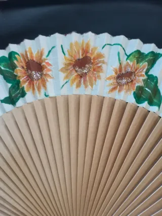 abanico de madera con un diseño pintado a mano de girasoles. De la tienda Zadi de Sevilla - Abanico plegable. - Incluye funda de tela con estampado floral.