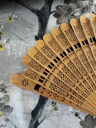 lote de 2 abanicos 🪭 de madera de tamaño medio, sin apenas uso. No tienen ninguna varilla rota , están impecables