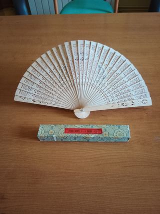 Precioso abanico de madera con un diseño calado muy detallado. - Material: Madera. - Diseño: Calado con motivos florales y geométricos. - Mecanismo: Plegable.