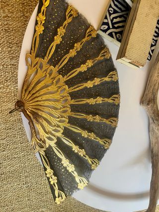 Elegante abanico de mano con un diseño intrincado. - Tela de encaje negro con motivos florales. - Ribetes y detalles en hilo dorado. - Varillas de madera. - Cuentas decorativas en el enganche.para festeras falleras y para huertanas etc etc