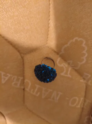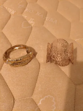 Conjunto de dos piezas de joyería. - Pulsera con diseño de pluma. - Brazalete con detalles calados. - Anillo azul - Cinturón de flores - Cinturón azul - Anillo piedrecitas - Abanico