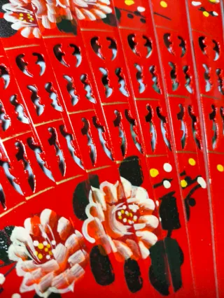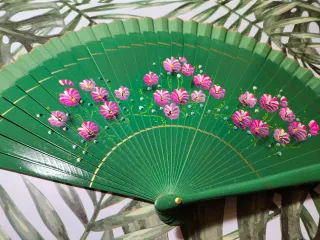 Precioso abanico artesanal de madera, pintado a mano con un diseño floral. - Pintura detallada de flores en tonos rosas y fucsia. - Base de madera. - Adorno dorado.