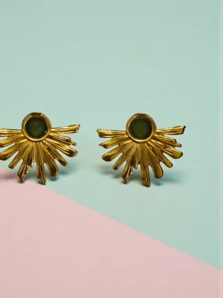 Elegantes pendientes vintage con un diseño inspirado en un abanico y una piedra central. - Acabado chapado en oro. - Piedra central de color verde. - Diseño detallado y llamativo.