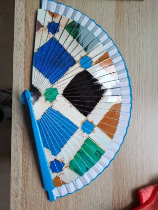 Abanico de "Artesanía Medina", de Granada. Presenta un diseño inspirado en azulejos. - Diseño con motivos geométricos. - Colores vibrantes y variados. - Borde festoneado.