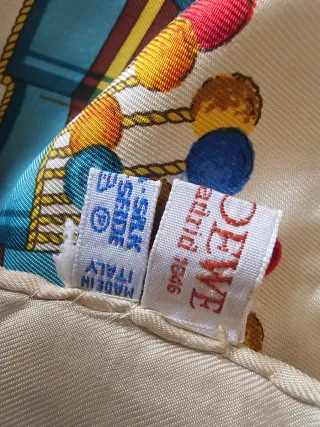 Elegante pañuelo de seda de Loewe con un diseño vibrante de abanicos. - 100% Seda - Diseño de abanicos - Borde decorado - 85 x 85cms Brand: Loewe Madrid Colour: Cream, Turquoise, Golden Yellow Condition: Vintage, Vibrant colours, no holes, very good condition. Hand rolled edges, Spanish Fan Design. Excellent Vintage piece by Madrid based Loewe brand.