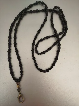 Este porta abanicos es un accesorio elegante y funcional. - Elaborado con cuentas negras redondas de Onix y madera en forma de judía. - Detalle de cuentas plateadas. - Cierre tipo mosquetón.