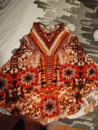 Vestido con un llamativo estampado étnico. - Diseño sin mangas. - Estampado vibrante con detalles en forma de abanico. - Corte holgado.
