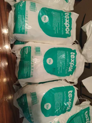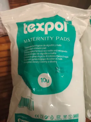 13 Paquete de compresas de maternidad Texpol. - Contiene 130 unidades. - Fabricadas con algodón y malla.