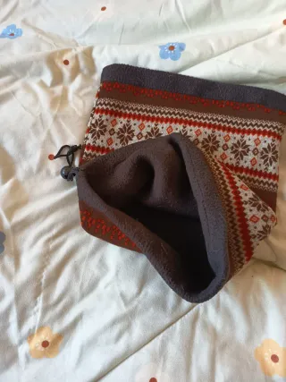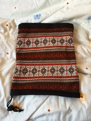Braga de cuello con un diseño de estilo nórdico y estampado de grecas y copos de nieve. - Tejido suave y cálido. - Cierre con cordón ajustable.