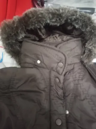 Chaquetón largo de color marrón con capucha. - Cierre de botones. - Bolsillos con cremallera. - Detalle de costuras. - Forro de pelo en la capucha.esta impecable .regalo luces de navidad