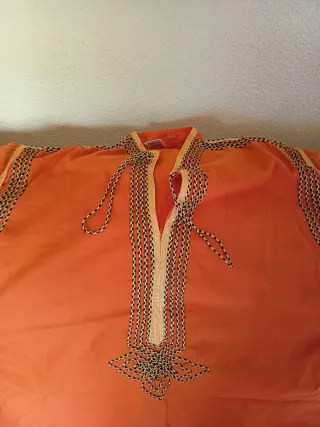 Comprada el año pasado durante mi viaje a Egipto. Chilaba tradicional de Egipto con un diseño bordado en el cuello y las mangas. - Color naranja vibrante. - Bordados dorados y negros. - Manga larga. - Cuello redondo con abertura.