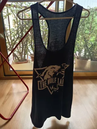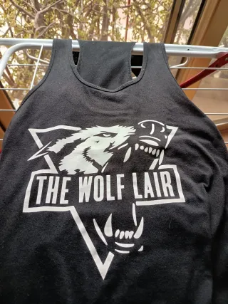 Camiseta de tirantes con un diseño gráfico de lobo y el texto The Wolf Lair. - Diseño frontal de lobo. - Estilo tank top o camiseta sin mangas.