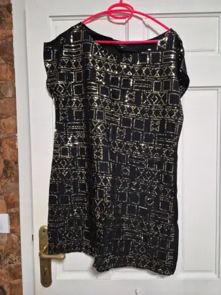 Vestido corto con un diseño llamativo de lentejuelas. - Diseño geométrico con lentejuelas doradas. - Manga corta. - Cuello redondo.