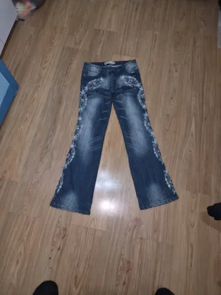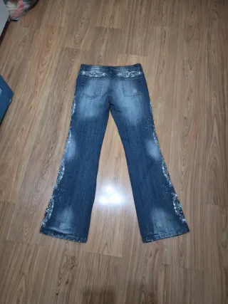 Pantalones vaqueros de corte acampanado con un diseño llamativo. - Decoración de pedrería plateada en los laterales. - Lavado desgastado para un look moderno.