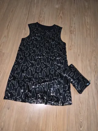 Conjunto de vestido sin mangas y bolso a juego, ambos adornados con lentejuelas. - Diseño con estampado de manchas plateadas. - Ideal para eventos o salidas nocturnas.