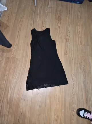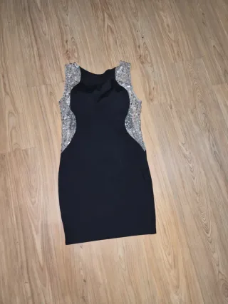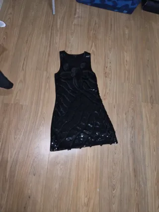 Elegante vestido negro con un intrincado diseño plateado que le da un toque brillante. Ideal para ocasiones especiales. - Diseño sin mangas. - Largo hasta la rodilla. - Tejido con detalles brillantes.