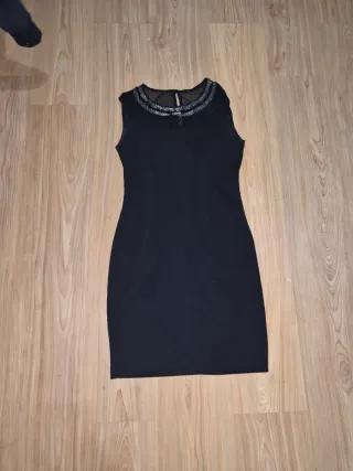 Elegante vestido negro sin mangas con detalles de pedrería en el cuello. - Cuello redondo con adornos. - Diseño sin mangas. - Corte ajustado.