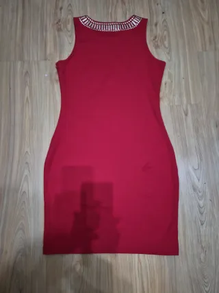 Vestido corto rojo con tachuelas doradas lleva una cremallera en el lateral