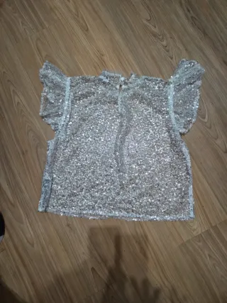 Elegante top con lentejuelas brillantes y detalles de volantes. - Diseño con cuello alto. - Mangas cortas con volantes. - Acabado con lentejuelas.