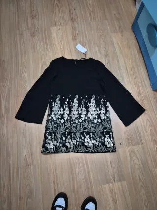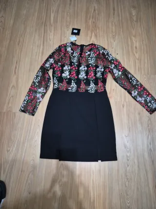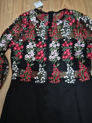 Elegante vestido negro con detalles bordados de flores en la parte superior y mangas. - Diseño de manga larga. - Bordado floral multicolor. - Corte moderno.el cuerpo lleva las mangas transparentes y lleva el pechonen forma de corazon