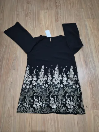 Elegante vestido negro con un delicado bordado floral en tonos dorados. - Diseño de manga larga. - Detalle de bordado en la parte inferior. - Cierre de cremallera en la espalda.