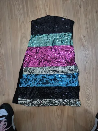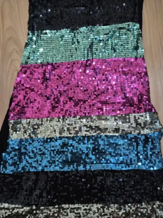 Camiseta de lentejuelas con un diseño de rayas vibrantes. Ideal para destacar en cualquier ocasión. - Diseño sin tirantes. - Rayas horizontales en negro, verde menta, rosa, plateado, azul y negro. - Acabado brillante. Lleva bolsillos