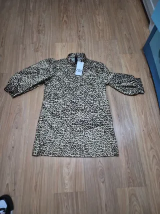 Vestido de Zara con un llamativo estampado de leopardo en tonos marrones y dorados. Presenta un diseño con cuello alto y mangas abullonadas. - Cuello alto. - Mangas abullonadas. - Estampado de leopardo.lleva hilo dorado brillante