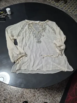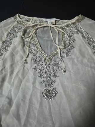 Elegante blusa de tela ligera con detalles de pedrería. - Diseño con escote en V y cordones. - Mangas largas con adornos. - Adornos de pedrería en el cuello y puños.