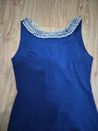Elegante vestido azul con un detalle de pedrería en el cuello. - Diseño sin mangas. - Escote adornado con perlas y cuentas. - Corte ajustado.