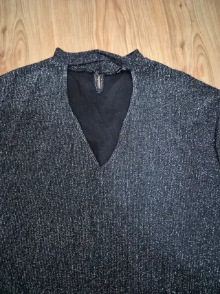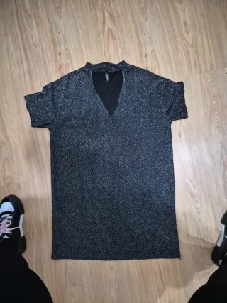 Vestido corto con un diseño brillante y moderno. - Tejido con acabado metalizado. - Escote pronunciado en pico. - Manga corta.