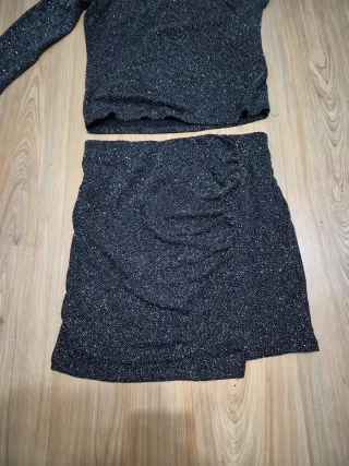 Conjunto de dos piezas con un diseño moderno y brillante. - Top de manga larga con escote asimétrico. - Falda corta con detalle drapeado. - Tejido con acabado metalizado plateado.