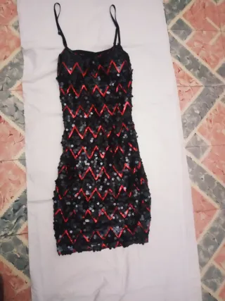 Vestido corto de fiesta con un diseño llamativo. - Detalle de lentejuelas brillantes. Por detrás sin lentejuelas - Patrón zigzag en rojo. - Tirantes finos. Impecable v