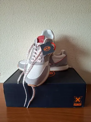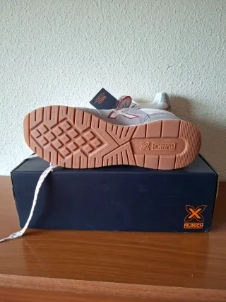 Zapatillas deportivas Munich en tonos grises y blancos. Perfectas para el día a día. - Diseño moderno y cómodo. - Cordones blancos con detalles rojos. - Suela de goma. - Detalle de logo en la lengüeta.