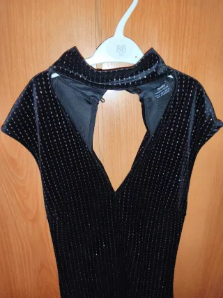 Body de Bershka con un diseño llamativo y elegante. - Tejido de terciopelo negro con detalles plateados brillantes. - Escote pronunciado en pico y espalda descubierta. - Cuello alto. - Manga corta.