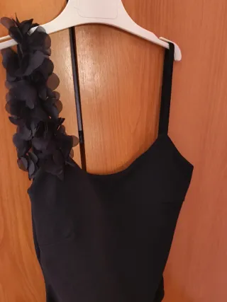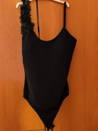 Body elegante con detalle de flores en el hombro. - Diseño asimétrico con una sola manga. - Espalda descubierta. - Adorno de flores en el tirante.