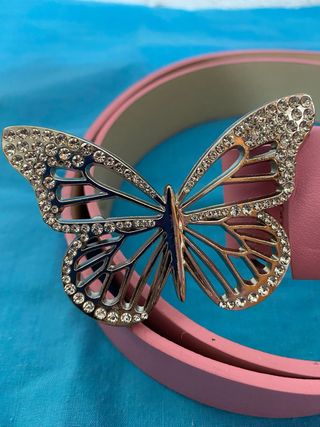Cinturón de mujer con un bonito diseño de mariposa. Ver fotos una puesta - Hebilla con forma de mariposa plateada. - Detalles brillantes en la mariposa. - Correa de color rosa.