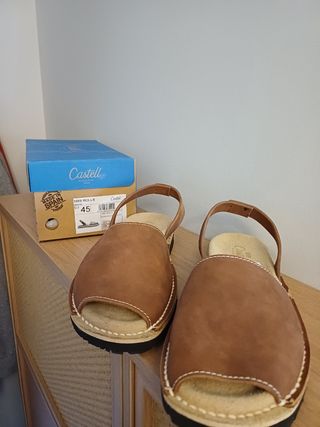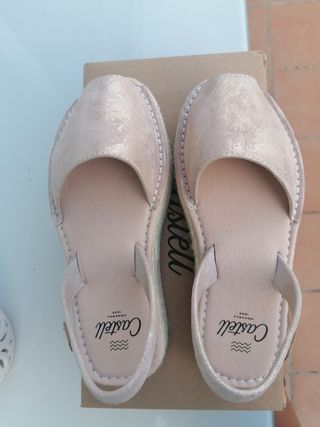 Abarca de Menorca, marca Castell color piedra. Suela neumatico. Es la autentica. La tira no se baja. resistente y bonita. Muy poco usadas. Las compré por encargo pero mi numero esel 39.